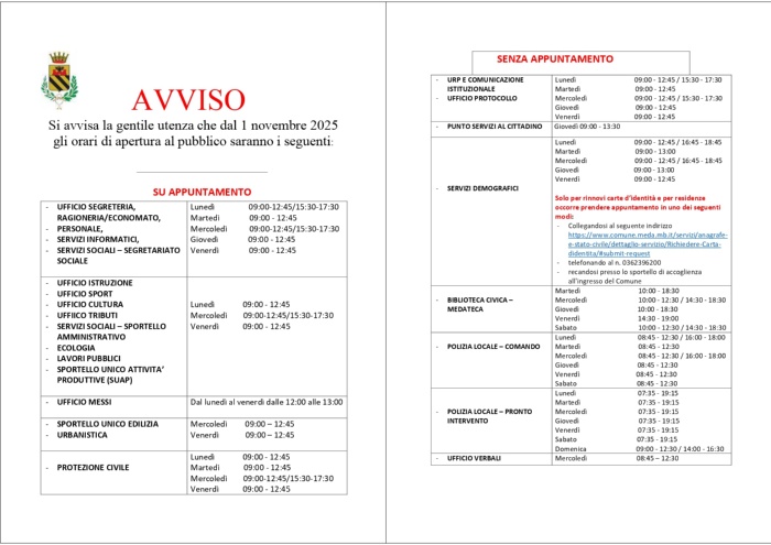 Descrizione Con Ordinanza Sindacale n. 36 del 01.10.2025 il SIndaco ha disposto la modifica degli orari degli uffici comunali con decorrenza 01.11.2025 come sotto specificato: Ordinanza Sindacale n. 36 del 01.10.2025 ( - Byte)