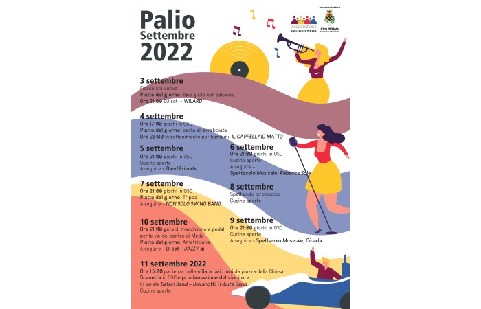 Sostegno al cartellone, con patrocinio e contributo, viene convintamente dal Comune di Meda. “Il Palio è momento primario nella vita della nostra comunità”, sottolinea l’assessore agli Eventi e alla Cultura Fabio Mariani.