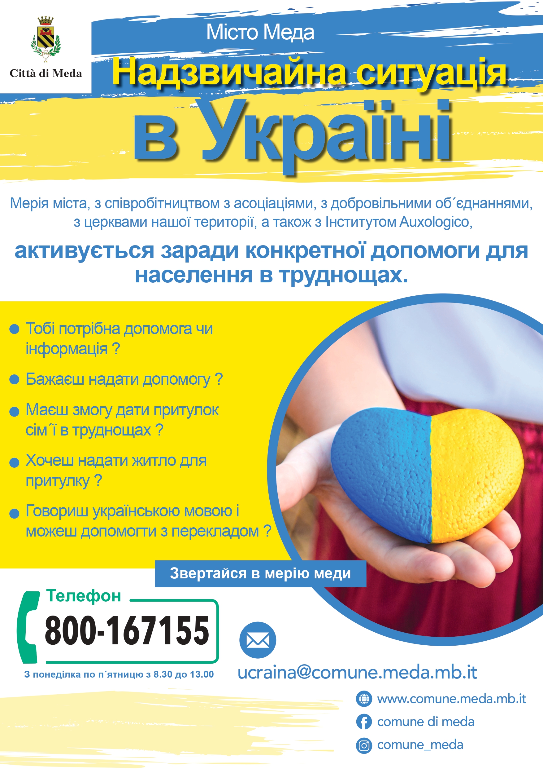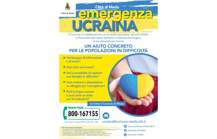 Мерія міста Меда, з співробітництвом з асоціаціями, з добровільними об´єднаннями, з церквами нашої території, а також з Інститутом Auxologico, активується заради конкретної допомоги для населення України, що через збройний конфлікт з Росією ,приїхали до Італії.Для інформації чи допомоги, для тих, хто має бажання приютити сім´ю в труднощах, або надати житло ,або має можливість допомогти з перекладом, необхідно зателефонувати в мерію м.Меда за номером 800.167.155( з понеділка по п´ятницю з 8.30 до 13.00 ) або написати на електронну адресу ucraina@comune.meda.mi.it. Біженці з України,прибувші на територію через надзвичайну ситуацію, будуть вважатися легалізованими на три місяці. У всякому разі , на протязі восьми днів з прибуття, необхідно вислати на адрес PEC Еміграційного Офісу Квестури Декларацію про присутність, прикріпивши ксерокопію паспорту. Крім того, особи, що надають притулок повинні до 48 годин від прибуття біженців вислати також Декларацію про гостинність. Можна завантажити необхідні модулі на даній сторінці. За допомогою для висилання документів до квестури чи за допомогою при заповненні документів , можна звертатися до місцевої поліції Polizia Locale( tel.0362.342074)