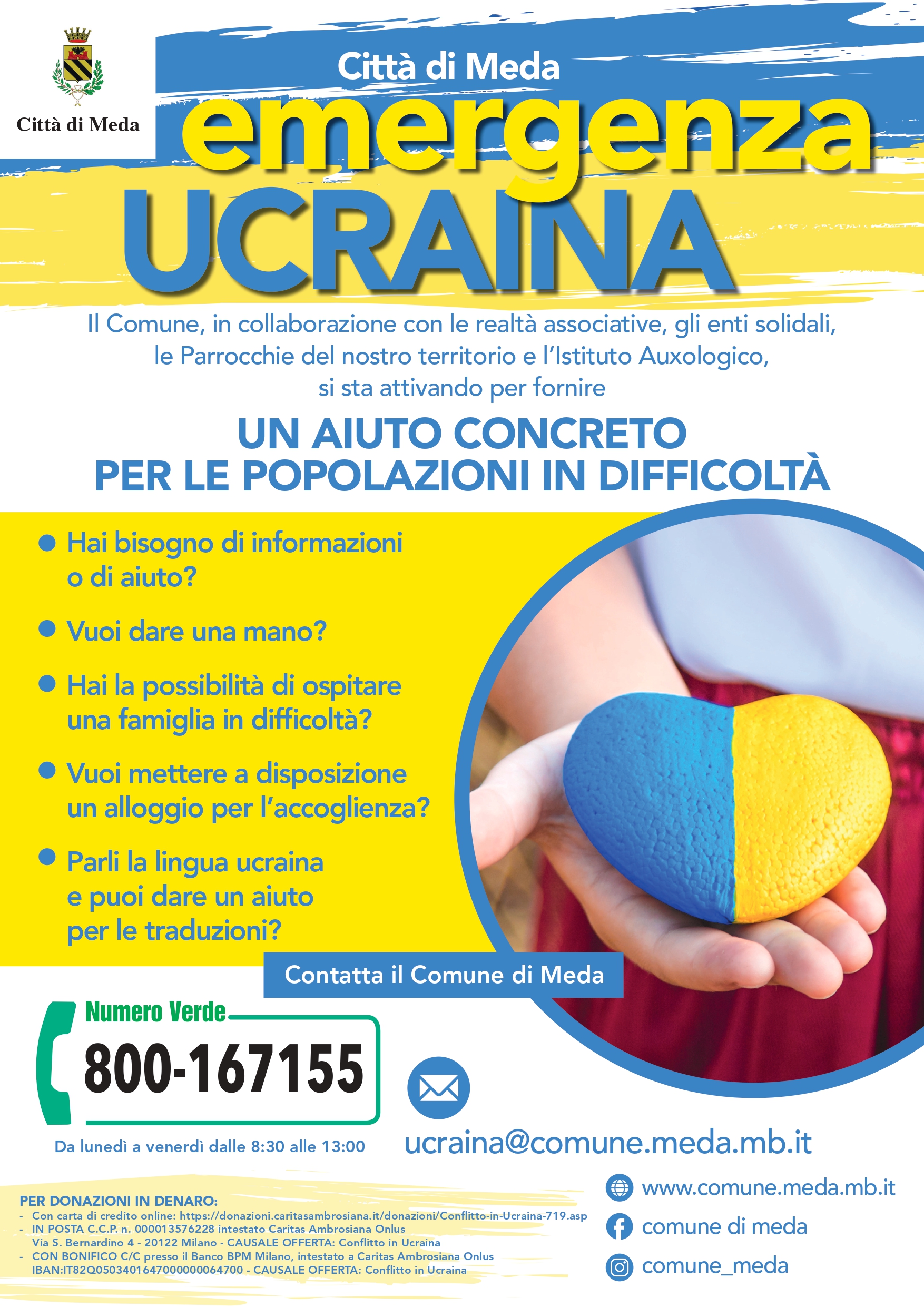 Il Comune di Meda, in collaborazione con le realtà associative, gli enti solidali, le Parrocchie del nostro territorio e l'Istituto Auxologico, si sta attivando per fornire un aiuto concreto per le popolazioni in difficoltà a causa del conflitto armato in Ucraina che raggiungono il nostro Paese. Per richieste di informazioni o aiuto, per segnalare la propria disponibilità a ospitare una famiglia in difficoltà, per mettere a disposizione un alloggio per l'accoglienza o per dare supporto nell'attività di traduzione, è possibile contattare il Comune di Meda telefonando al numero verde 800.167.155 (da lunedì a venerdì dalle 8:30 alle 13:00) oppure scrivendo all'indirizzo di posta elettronica dedicato ucraina@comune.meda.mb.it. I profughi ucraini giunti sul territorio nell'ambito dell'emergenza in corso saranno considerati regolari per tre mesi. In ogni caso, entro otto giorni dall’arrivo, dovrà essere inoltrata all’indirizzo PEC dell’Ufficio Immigrazione della Questura una dichiarazione di presenza, allegando fotocopia del passaporto. Inoltre gli eventuali soggetti ospitanti, entro le 48 ore dall’arrivo, dovranno inviare apposita dichiarazione di ospitalità. E' possibile scaricare i relativi modelli in allegato a questa pagina. Per procedere all'invio della documentazione alla Questura e per assistenza nella compilazione è possibile contattare il Corpo di Polizia Locale (Tel. 0362.342074).