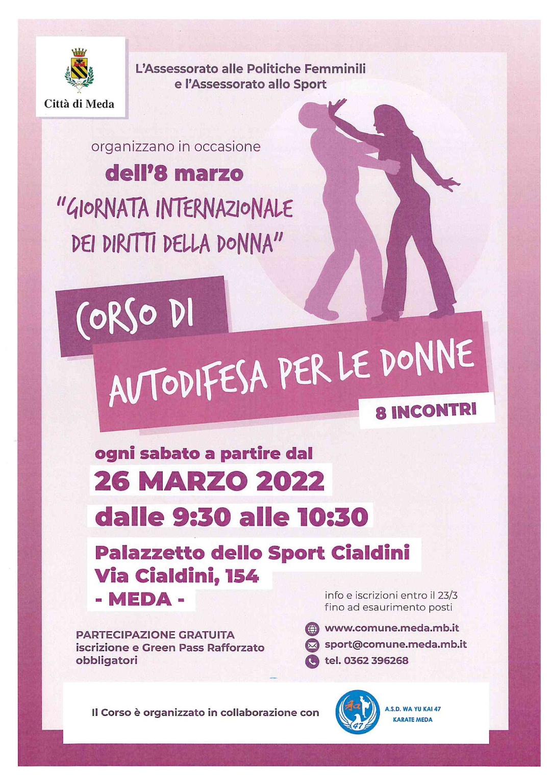 Le Donne interessate (residenti a Meda, di maggiore età e titolari di green pass rafforzato) possono trovare i moduli per l’iscrizione (obbligatoria) sul sito istituzionale del Comune www.comune.meda.mb.it