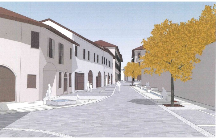 - La riqualificazione degli spazi pubblici sia con pavimentazioni in pietra naturale e nuova illuminazione, sia soprattutto mediante la creazione di spazi pubblici attrezzati da sedute, specchiature d’acqua, alberature.