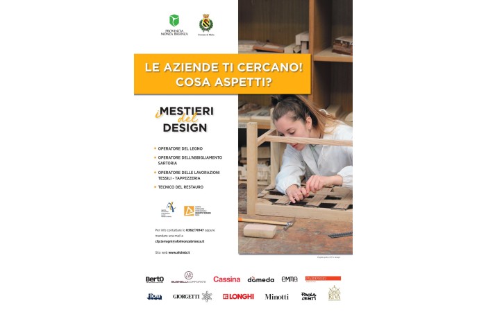 Falegname, Tappezziere, Cucitrice: sono questi i mestieri della nostra tradizione che hanno reso famoso il nostro distretto. Abilità e conoscenze che, allora come oggi, richiedono perizia, maestria e competenze specifiche. Di queste figure professionali c’è molto bisogno nelle dodici realtà (Berto, Busnelli Corporate, Cassina, dàmeda, emma, Flexform, Flou, Giorgetti, Longhi, Minotti, Paola Lenti, Riva) che hanno dato vita con il Comune di Meda e il Centro di Formazione Professionale “Giuseppe Terragni” al progetto “I Mestieri del Design”.