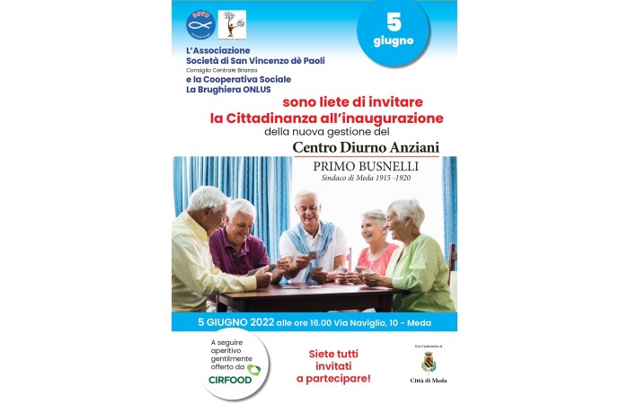 Associazione Società di San Vincenzo dè Paoli e Cooperativa Sociale la Brughiera Onlus invitano tutta la Cittadinanza all'inaugurazione della nuova gestione del CENTRO DIURNO ANZIANI
