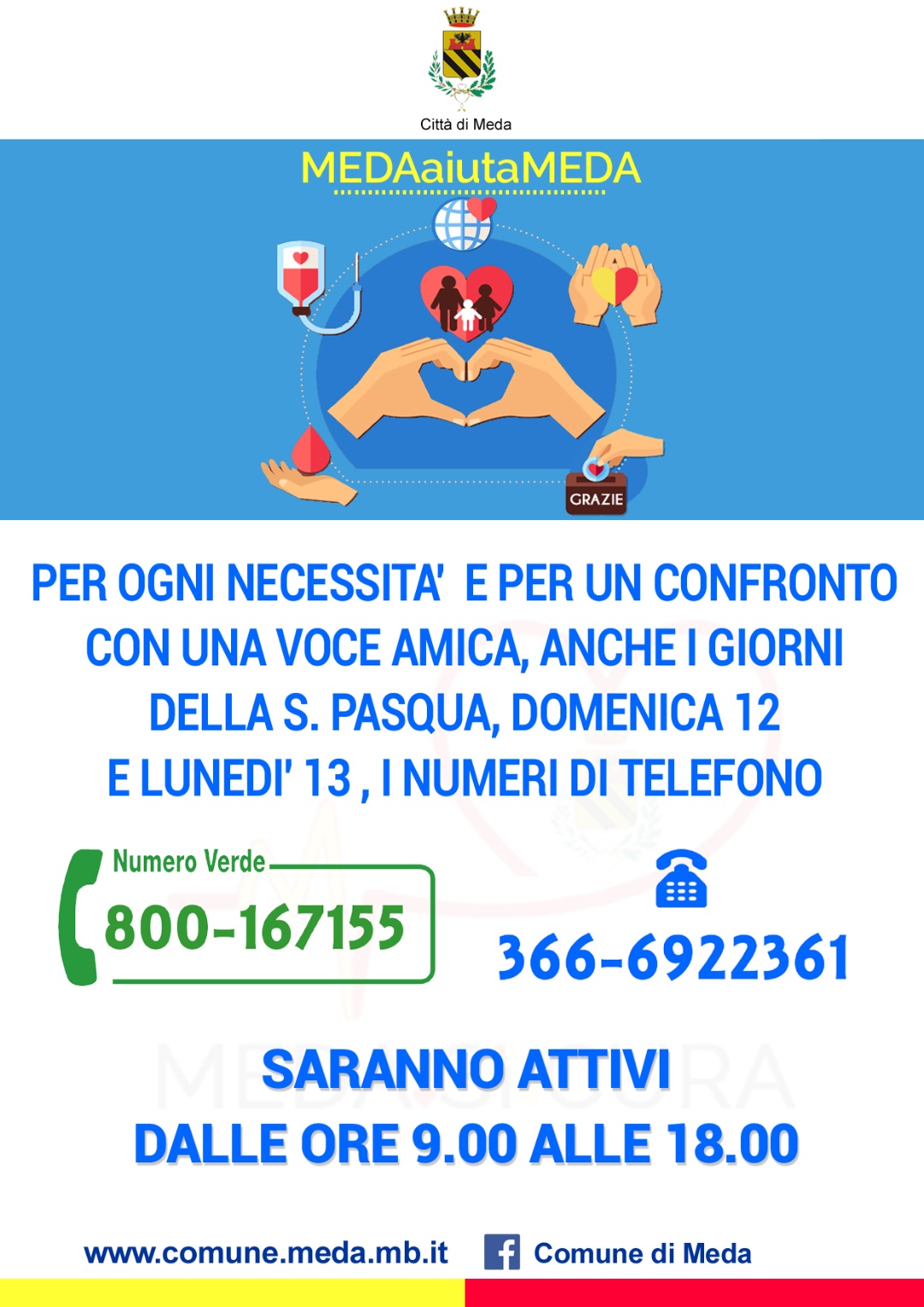 Si comunica che anche nelle giornate di domenica 12 aprile , Santa Pasqua, e lunedì 13 aprile, Lunedì dell'Angelo il numero verde 800-167155 e il numero 3666922361 saranno disponibili dalle ore 9:00 alle ore 18:00 per ogni necessità o per un confronto con una voce amica.