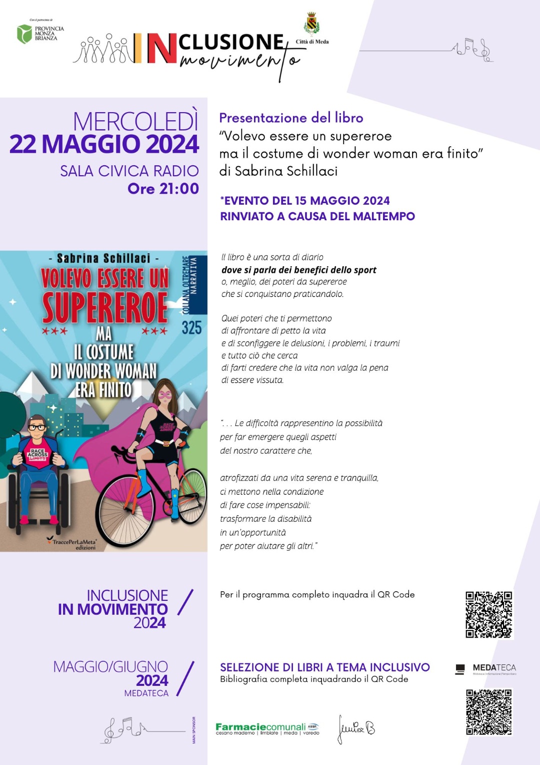 presso la Sala Civica "Radio", è programmato un incontro con Sabrina Schillaci, autrice del volume " Volevo essere un supereroe ma il costume di wonder woman era finito", Editore Ass. Cult. TraccePerLaMeta.