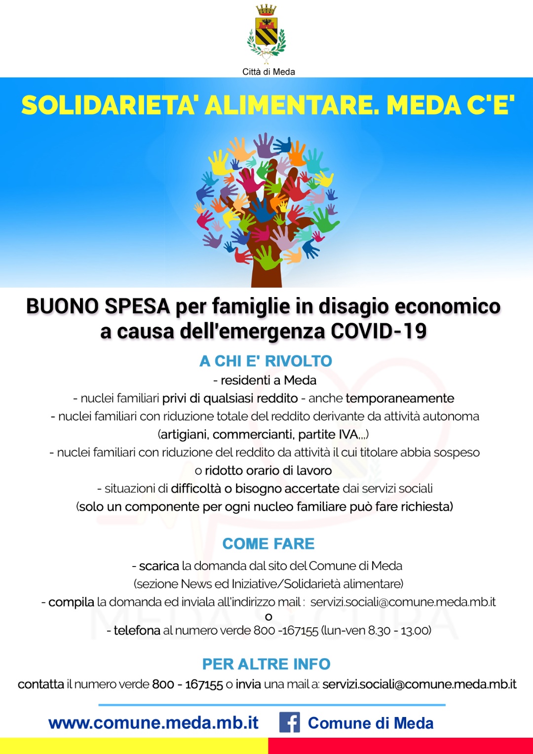 Al via l’intervento per dare un sostegno alle persone e ai nuclei familiari in situazione di forte disagio economico anche a causa del Coronavirus. Al Comune di Meda, con lo stanziamento di 400 milioni, sono stati destinati € 124.597,00 in base al numero dei residenti e al loro reddito medio. Si tratta della misura dei cosiddetti “Buoni Spesa”, finalizzati al sostegno alimentare dei cittadini in modo temporaneo e urgente. Detta somma è ripartita come segue: