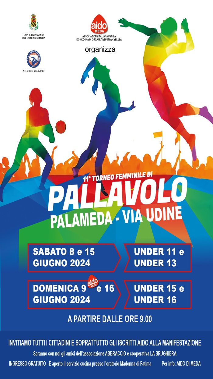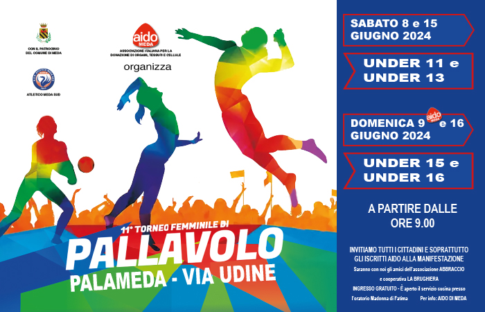 Con deliberazione n. 119 del 13.05.2024 è stato concesso all'Associazione AIDO MEDA il patrocinio per la realizzazione del Torneo di pallavolo femminile Under 16 in programma nei giorni 8 - 9 - 15 - 16 giugno 2024 presso il Palameda.