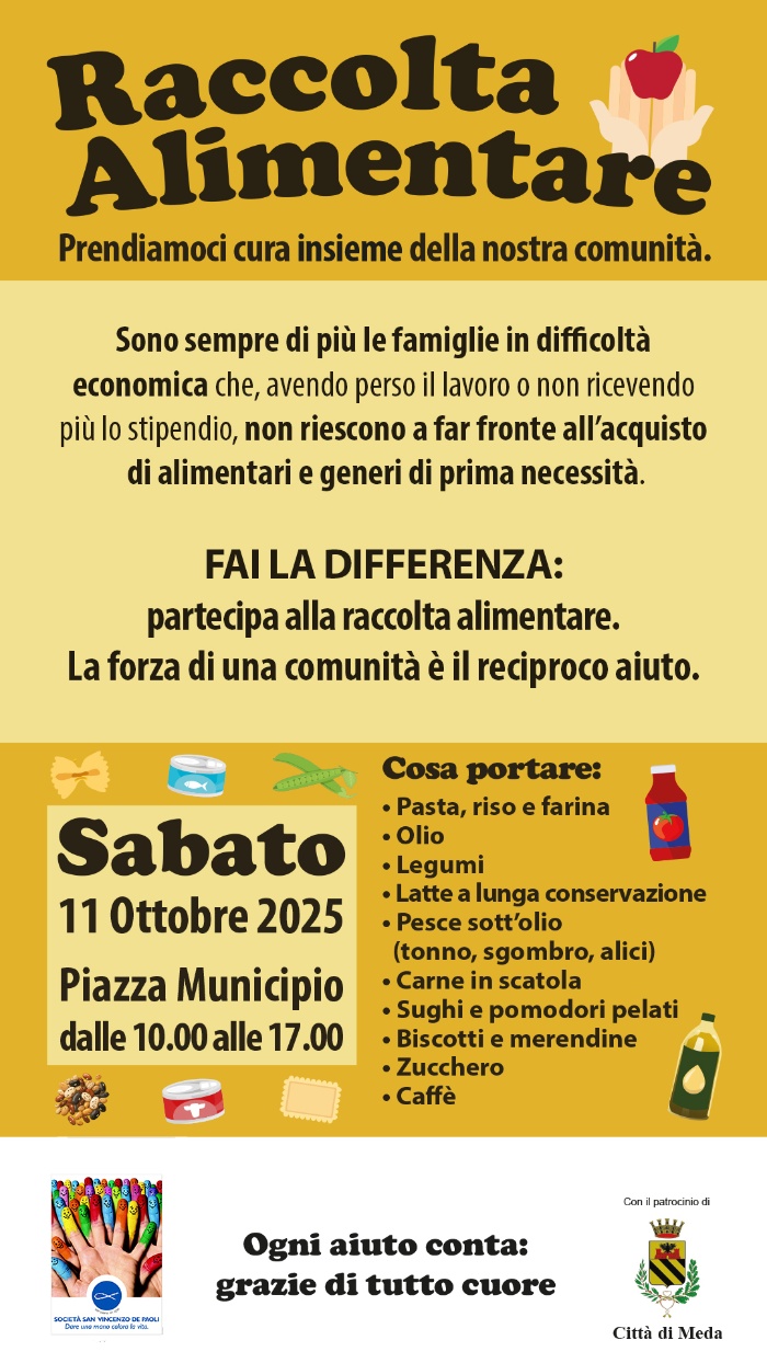 Per sostenere attivamente singoli e famiglie fragili la Conferenza San Vincenzo, con il Patrocinio del Comune di Meda, ha organizzato una raccolta di prodotti alimentari a lunga conservazione di prima necessità.