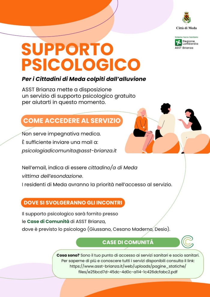 Non serve impegnativa medica. È sufficiente inviare una mail a: psicologiadicomunita@asst-brianza.it Nell’email, indica di essere cittadino/a di Meda vittima dell’esondazione. I residenti di Meda avranno la priorità nell’accesso al servizio.