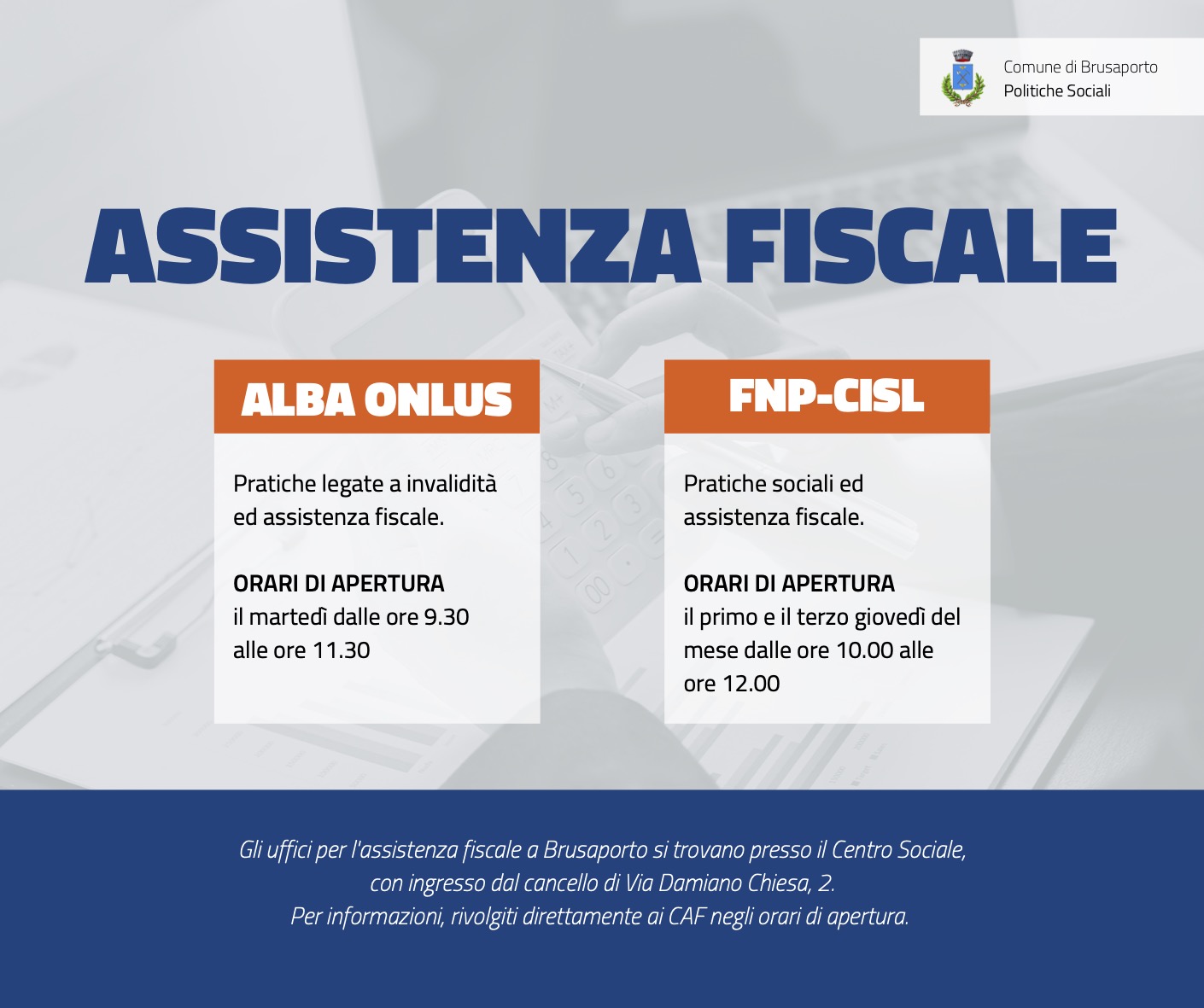 Continua il lavoro dell'Assessorato alle Politiche Sociali per garantire la continuità di tutti i servizi. Di seguito i giorni e gli orari di apertura dei CAF presso il Centro Sociale di Brusaporto.