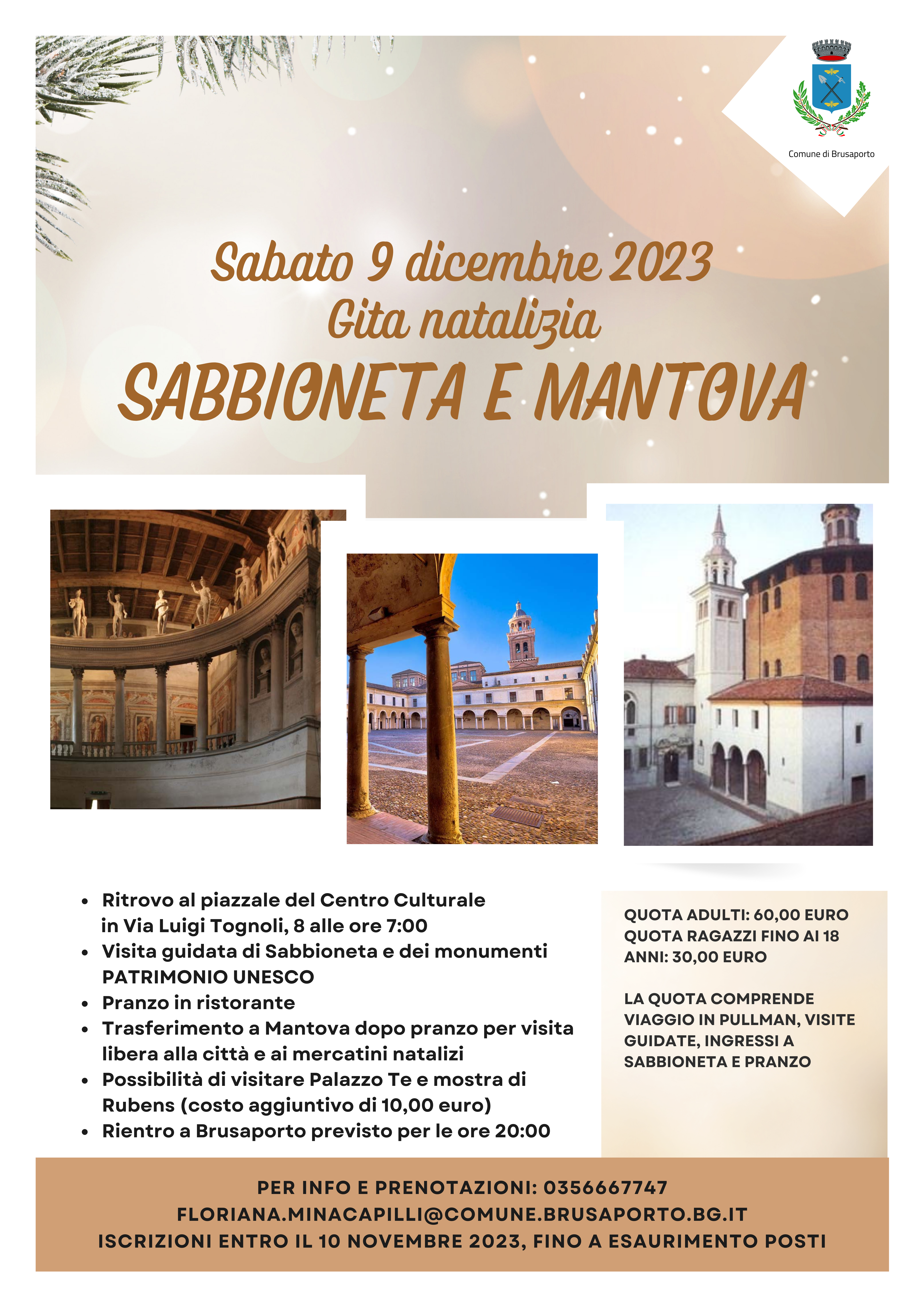 Il Comune di Brusaporto propone una gita natalizia a Sabbioneta e Mantova sabato 9 dicembre 2023. Ritrovo alle ore 7:00 sul piazzale del Centro Culturale in Via Luigi Tognoli, 8.