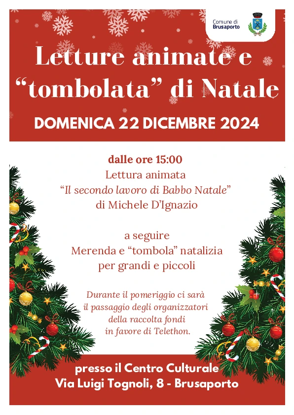 Si inizia con una lettura animata dal titolo “Il secondo lavoro di Babbo Natale” di Michele D’Ignazio. A seguire merenda per tutti e una grande "tombola" natalizia per grandi e piccoli con tanti premi.